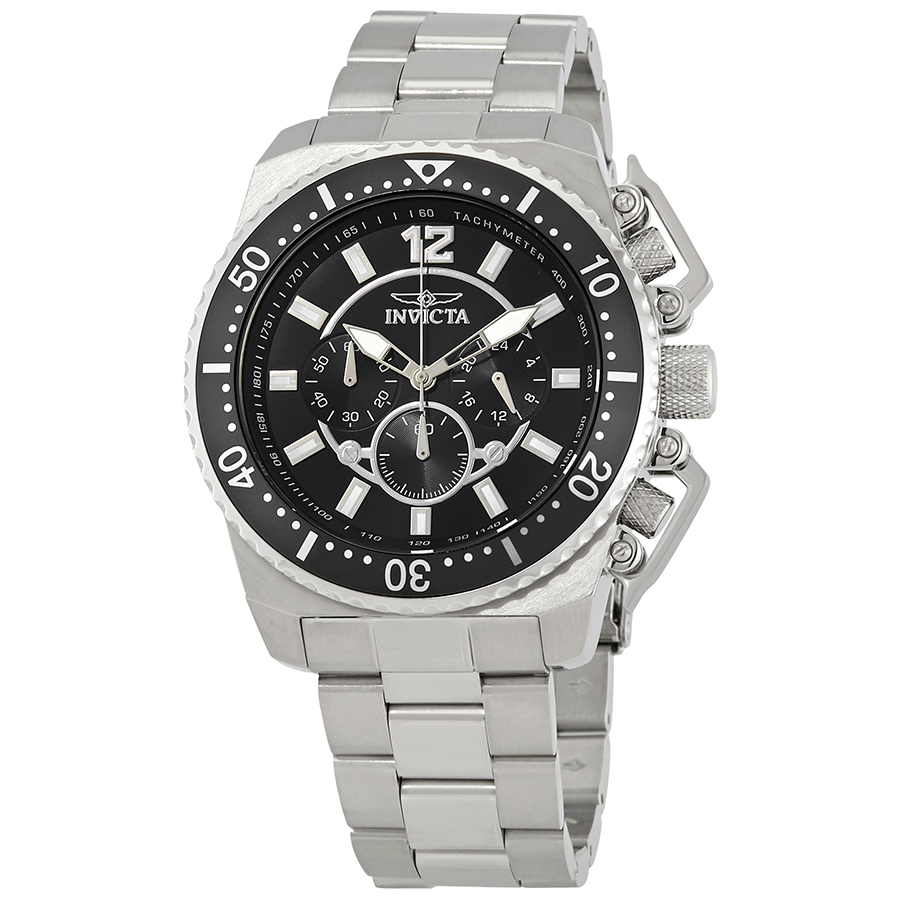 Stainless steel case and stainless steel bracelet. Uni-directional rotating stainless steel bezel with a black top ring. Black dial with luminous silver-tone hands and index hour markers. An Arabic numeral appears at the 12 o'clock position. Tachymeter markers around the outer rim. Dial Type: Analog. Luminescent hands and markers. Chronograph - three sub-dials displaying: 60 second, 60 minute and 24 hour. Hattori caliber VD54 quartz movement. Scratch resistant flame fusion crystal. Pull / push crown. Solid case back. Round case shape. Case size: 48 mm. Case thickness: 17 mm. Band width: 24 mm. Fold over clasp with a safety release. Water resistant at 100 meters / 330 feet. Functions: chronograph, GMT, second time zone, hour, minute, second. Additional Info: in general, suitable for swimming and snorkeling, but not diving. Sport watch style. Invicta Pro Diver Chronograph Black Dial Mens Watch 21952.