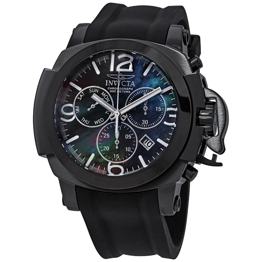 Black ion-plated stainless steel case with a black silicone strap. Fixed black ion-plated bezel. Black mother of pearl dial with luminous silver-tone hands and index hour markers. Arabic numerals mark the 3, 6, 9 and 12 o'clock positions. Minute markers around the outer rim. Dial Type: Analog. Luminescent hands and markers. Date display between the 4 and 5 o'clock positions. Chronograph - three sub-dials displaying: 60 second, 30 minute and 1/10th of a second. Caliber: 6371B quartz movement. Scratch resistant flame fusion crystal. Screw down crown. Solid case back. Case size: 48 mm. Oval case shape. Band width: 26 mm. Band length: 8.25 inches. Tang clasp. Water resistant at 300 meters / 1000 feet. Functions: chronograph, date, hour, minute, second. Casual watch style. Invicta I-Force Chronograph Mother of Pearl Dial Mens Watch 22279.