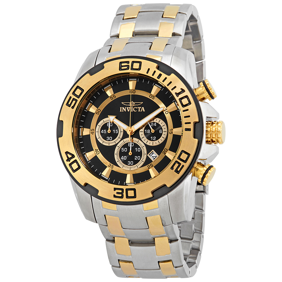 The beautiful Invicta 22322 watch features a stainless steel 50mm case, with a uni-directional rotating bezel, and a black and gold dial covered by a flame fusion crystal. The stylish wristwatch is equipped with an exclusive 26mm stainless steel which combines comfort and sturdiness. This horological trendy device has chronograph, date, GMT, second time zone, hour, minute, second functions.