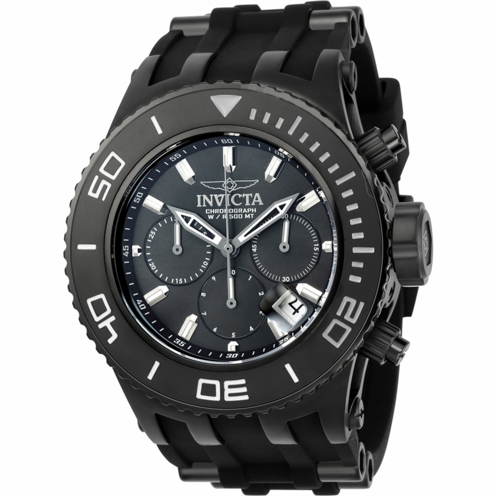 Black ion-plated stainless steel case with a black silicone strap with black ion-plated inserts. Uni-directional black ion-plated bezel with a black top ring. Black dial with silver-tone skeleton hands and index hour markers. Minute markers around the outer rim. Dial Type: Analog. Luminescent hands and markers. Date display between the 4 and 5 o'clock positions. Chronograph - three sub-dials displaying: 60 second, 30 minute and 1/10th of a second. Caliber: 6371D quartz movement. Scratch resistant flame fusion crystal. Screw down crown. Solid case back. Case size: 52 mm. Case thickness: 16 mm. Round case shape. Band width: 31 mm. Band length: 8.25 inches. Tang clasp. Water resistant at 500 meters / 1650 feet. Functions: chronograph, date, hour, minute, second. Casual watch style. Invicta Subaqua Chronograph Black Dial Mens Watch 22367.