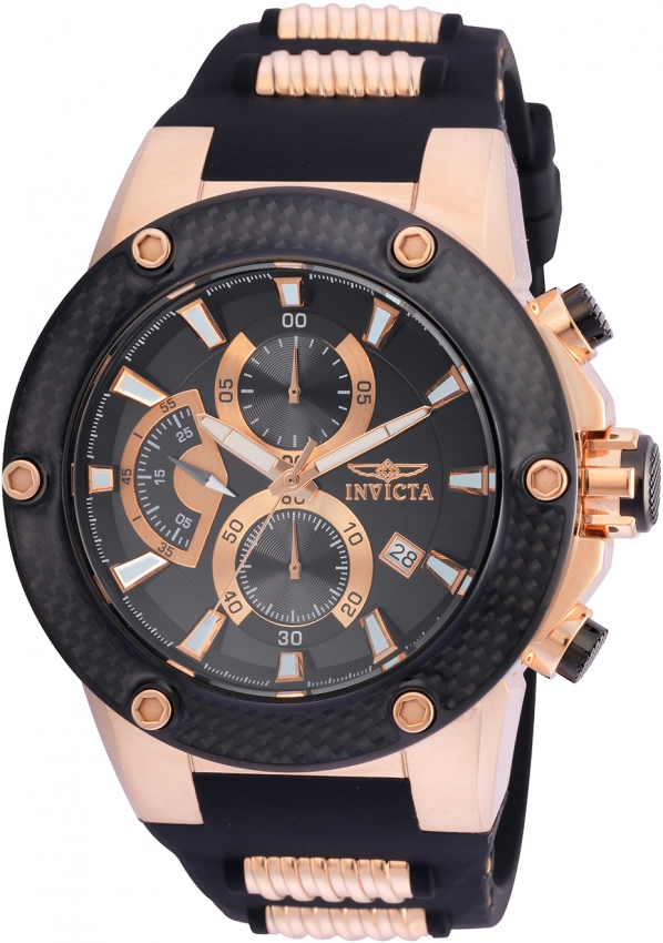 Rose gold-plated stainless steel case with a black silicone strap with rose gold-plated stainless steel barrel inserts. Fixed black carbon fiber bezel. Black dial with luminous rose gold-tone hands and index hour markers. Minute markers around the outer rim. Dial Type: Analog. Luminescent hands and markers. Date display at the 4 o'clock position. Chronograph - three sub-dials displaying: 60 second, 60 minute and 1/10th of a second. Hattori caliber VD57 quartz movement. Scratch resistant flame fusion crystal. Pull / push crown. Solid case back. Round case shape. Case size: 51 mm. Case thickness: 17 mm. Band width: 30 mm, band length: 9.5 inches. Tang clasp. Water resistant at 100 meters / 330 feet. Functions: chronograph, date, hour, minute, second. Sport watch style. Invicta Speedway Chronograph Black Dial Mens Watch 22402