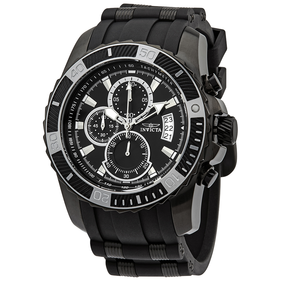 Black ion-plated stainless steel case with a black polyurethane strap with black ion-plated inserts. Uni-directional rotating stainless steel bezel with black inlay. Black dial with luminous silver-tone hands and index hour markers. Minute markers. tachymeter markings around the outer rim. Dial Type: Analog. Luminescent hands and markers. Date display at the 3 o'clock position. Chronograph - three sub-dials displaying: 60 second, 60 minute and 1/10th of a second. Hattori caliber VD57 quartz movement. Scratch resistant flame fusion crystal. Pull / push crown. Solid case back. Round case shape. Case size: 45 mm. Case thickness: 17 mm. Band width: 26 mm. Band length: 8.35 inches. Tang clasp. Water resistant at 100 meters / 330 feet. Functions: chronograph, date, hour, minute, second, tachymeter. Additional Info: in general, suitable for swimming and snorkeling, but not diving. Casual watch style. Invicta TI-22 Chronograph Black Dial Mens Watch 22433.