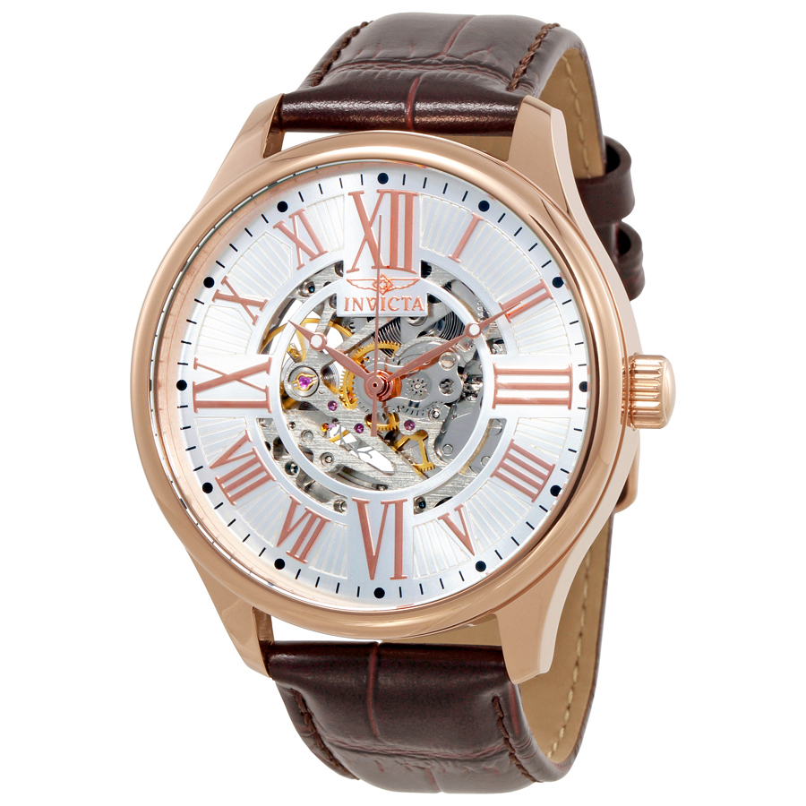 Rose gold-plated stainless steel case with a black leather strap. Fixed rose gold-plated bezel. Silver skeleton center dial with rose gold-tone hands and Roman numeral hour markers. Minute markers around the outer rim. Dial Type: Analog. Luminescent hands and markers. Caliber: 2650SSZ automatic movement with a 35-hour power reserve. Scratch resistant flame fusion crystal. Pull / push crown. Transparent case back. Case size: 45 mm. Case thickness: 13 mm. Round case shape. Band width: 22 mm. Band length: 7.45 inches. Tang clasp. Water resistant at 50 meters / 165 feet. Functions: hour, minute, second. Casual watch style. Invicta Vintage Objet D Art Automatic Silver Dial Mens Watch 22569.