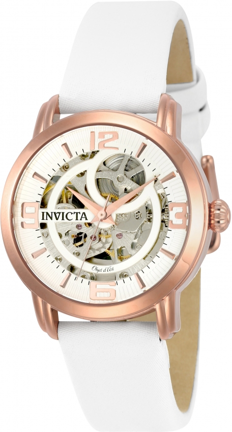 Rose gold-plated stainless steel case with a black satin strap. Fixed rose gold-plated bezel. Silver skeleton dial with rose gold-tone hands and index hour markers. Arabic numerals mark the 3, 6, 9 and 12 o'clock positions. Minute markers. Dial Type: Analog. Caliber: 2650 automatic movement. Scratch resistant flame fusion crystal. Pull / push crown. Transparent case back. Case size: 36 mm. Case thickness: 13 mm. Round case shape. Band width: 18 mm. Band length: 8.25 inches. Tang clasp. Water resistant at 50 meters / 165 feet. Functions: hour, minute, second. Casual watch style. Invicta Objet D Art Automatic Silver Skeleton Dial Mens Watch 22655.