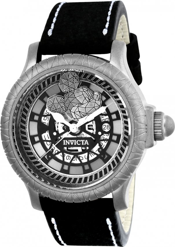 Silver-tone stainless steel case with a black leather strap. Fixed silver-tone stainless steel bezel. Silver dial with black hands and index hour markers. Dial Type: Analog. Luminescent hands and markers. Date display at the 3 o'clock position. Ronda Caliber 715 quartz movement. Scratch resistant flame fusion crystal. Pull / push crown. Solid case back. Round case shape, case size: 48 mm, case thickness: 14 mm. Band width: 24 mm, band length: 9 inches. Tang clasp. Water resistant at 100 meters / 330 feet. Functions: date, hour, minute, second. Additional Info: in general, suitable for swimming and snorkeling, but not diving. Casual watch style. Invicta Disney Limited Edition Silver Dial Mens Watch 22739.