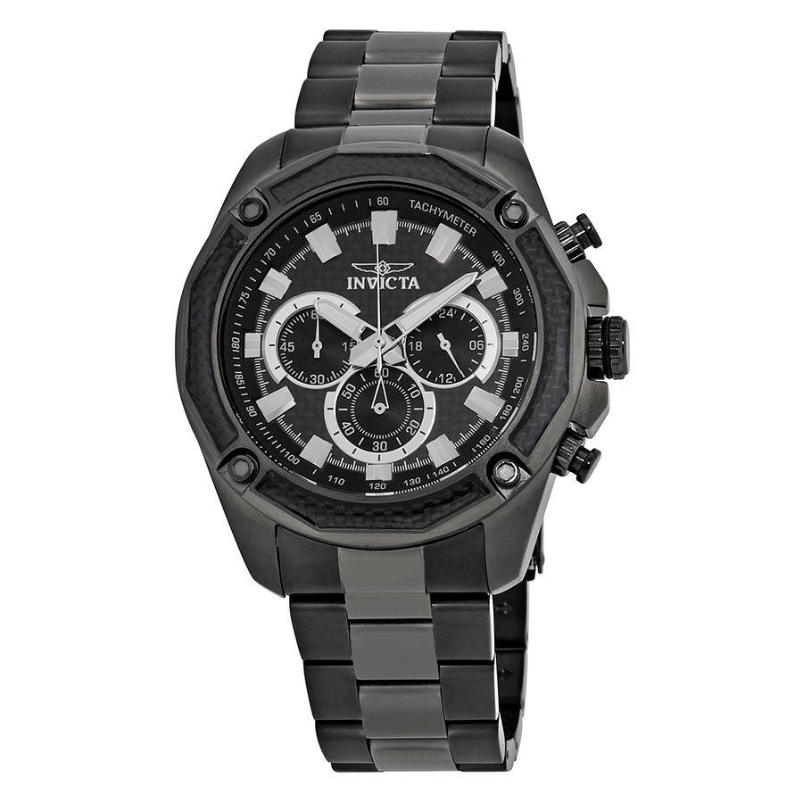 Black ion-plated stainless steel case and bracelet. Fixed black ion-plated bezel with a black carbon fiber inlay. Black carbon fiber dial with luminous silver-tone hands and index hour markers. Minute markers. Tachymeter markings around the outer rim. Dial Type: Analog. Luminescent hands and markers. Chronograph - three sub-dials displaying: 60 second, 60 minute and 24 hour. Caliber: VD54 quartz movement. Scratch resistant flame fusion crystal. Pull / push crown. Solid case back. Case size: 48 mm. Case thickness: 12 mm. Round case shape. Band width: 24 mm. Band length: 7.65 inches. Fold over clasp with a safety release. Water resistant at 100 meters / 330 feet. Functions: chronograph,ttachymeter, hour, minute, second. Casual watch style. Invicta Aviator Chronograph Black Dial Mens Watch 22807.