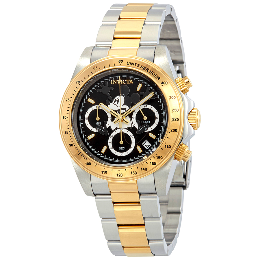 Silver-tone stainless steel case with a two-tone (silver-tone and yellow gold-plated) stainless steel bracelet. Fixed tachymeter scale yellow gold-plated stainless steel showing tachymeter markings bezel. Black dial with luminous yellow goldr-tone hands and index hour markers. Minute markers around the outer rim. Dial Type: Analog. Luminescent hands and markers. Date display between 4 and 5 o'clock position. Chronograph - three sub-dials displaying: 60 second, 60 minute and 24 hour. Hattori Caliber VD53 quartz movement. Scratch resistant mineral crystal. Screw down crown. Solid case back. Round case shape, case size: 39 mm, case thickness: 13 mm. Band width: 20 mm, band length: 8 inches. Fold over clasp. Water resistant at 200 meters / 660 feet. Functions: chronograph, date, hour, minute, second, tachymeter. Casual watch style. Watch label: Japan Movt. Invicta Disney Mickey Mouse Chronograph Black Dial Mens Watch 22866.