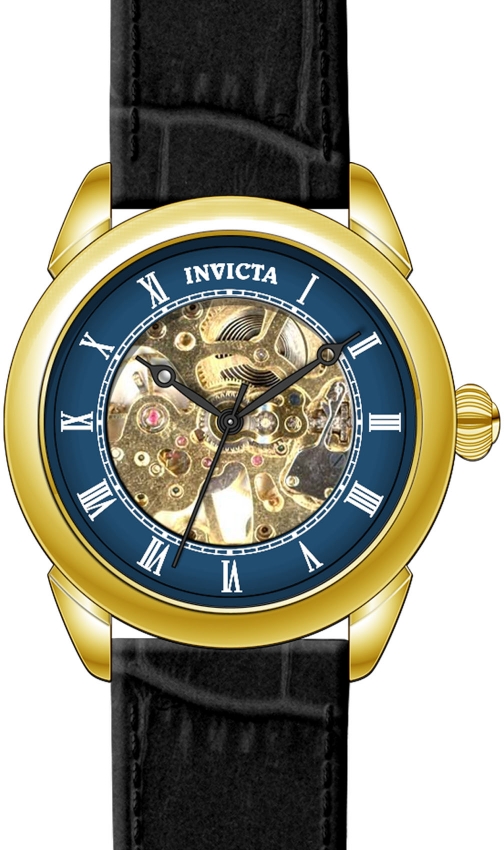 Yellow gold-plated stainless steel case with a black leather strap. Fixed yellow gold-plated bezel. Blue (skeleton center) dial with black hands and Roman numeral hour markers. Minute markers around an inner ring. Dial Type: Analog. Luminescent hands. Caliber SK7120 hand wind movement. Scratch resistant flame fusion crystal. Pull / push crown. Transparent case back. Round case shape. Case size: 42 mm. Case thickness: 12 mm. Band width: 22 mm. Band length: 7.85 inches. Tang clasp. Water resistant at 30 meters / 100 feet. Functions: hour, minute, second. Additional Info: n general, withstands splashes or brief immersion in water, but not suitable for swimming or bathing. Casual watch style. Invicta Specialty Mechanical Blue Skeleton Mens Watch 23536.