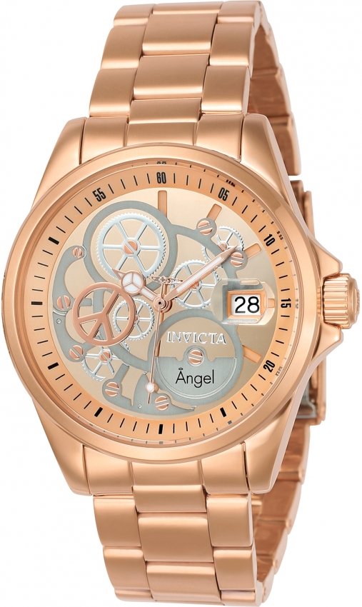 Rose gold-plated stainless steel case and bracelet. Fixed rose gold-plated bezel. Rose dial with luminous rose gold-tone hands. Minute markers around the outer rim. Dial Type: Analog. Luminescent hands. Date display at the 3 o'clock position. Caliber: 515 quartz movement. Scratch resistant mineral crystal. Screw down crown. Solid case back. Case size: 40 mm. Case thickness: 12 mm. Round case shape. Band width: 20 mm. Band length: 8.25 inches. Fold over clasp with a safety release. Water resistant at 200 meters / 660 feet. Functions: date, hour, minute, second. Casual watch style. Invicta AngelRose Dial Ladies Watch 23569.
