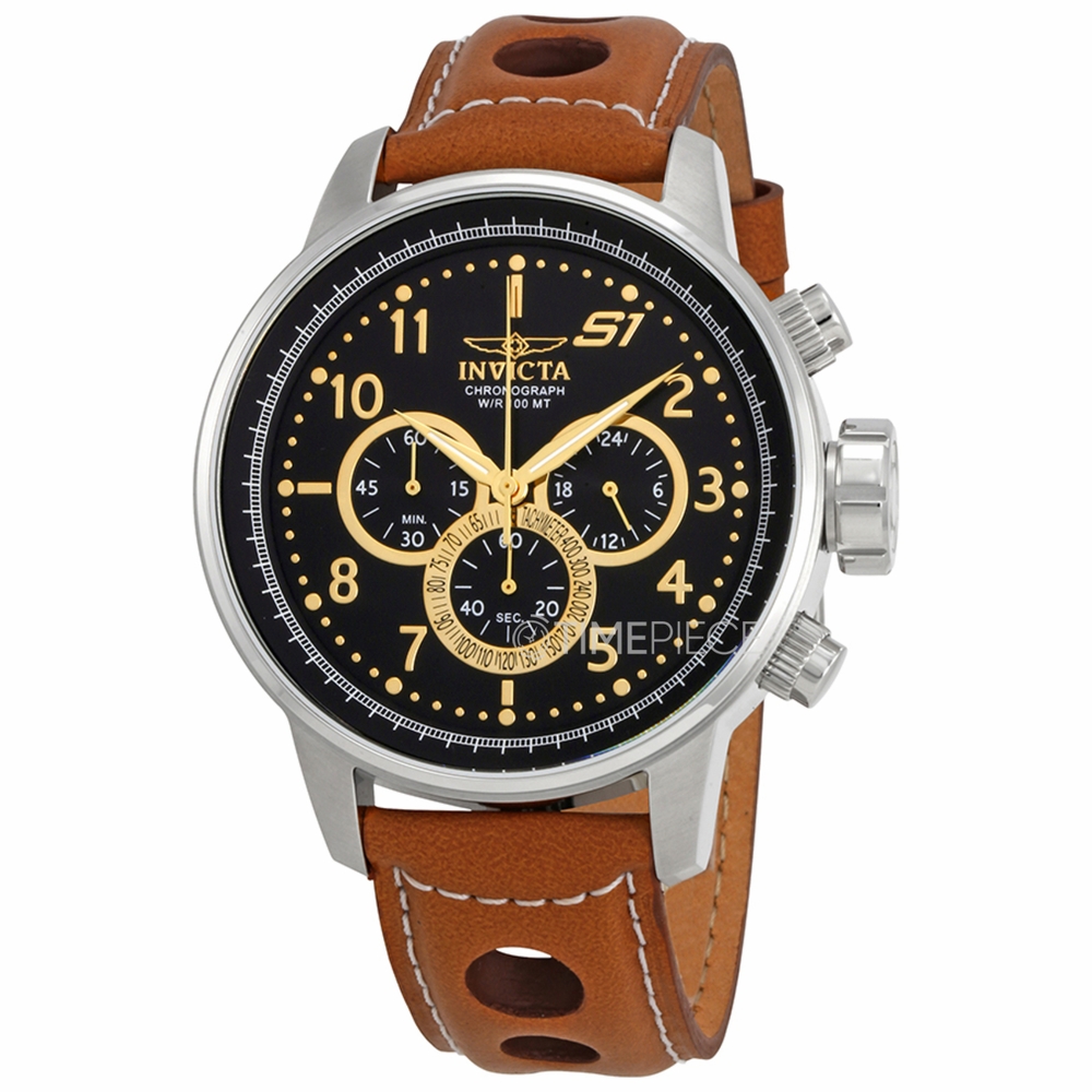 Stainless steel case with a tan leather strap. Fixed silver-tone bezel. Black dial with luminous bronze hands and Arabic numeral hour markers. Minute markers around the outer rim. Dial Type: Analog. Luminescent hands and markers. Chronograph - three sub-dials displaying: 60 second, dual tachymeter / 60 minute and 24 hour. Caliber VD54 quartz movement. Scratch resistant mineral crystal. Pull / push crown. Solid case back. Case size: 48 mm. Round case shape. Band width: 22 mm. Band length: 8.25 inches. Tang clasp. Water resistant at 100 meters / 330 feet. Functions: chronograph, tachymeter, date, hour, minute, second. Additional Info: suitable for swimming. Casual watch style. Invicta S1 Rally Chronograph Black Dial Mens Watch 23597.