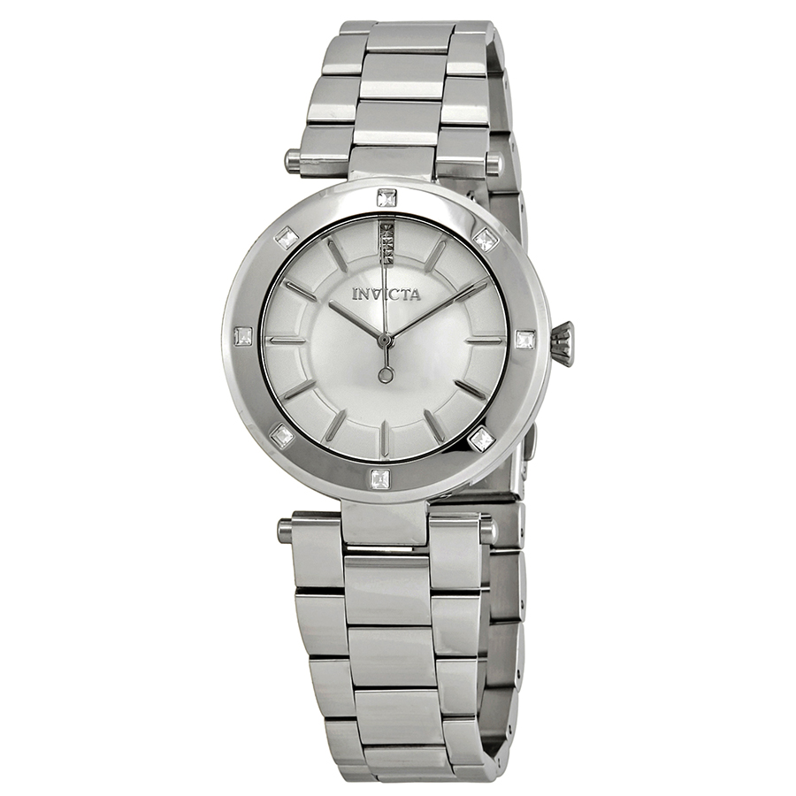 Stainless steel case with a stainless steel bracelet. Fixed stainless steel bezel set with crystals. Silver dial with silver-tone hands and index hour markers. Dial Type: Analog. Caliber: PC21 quartz movement. Scratch resistant flame fusion crystal. Pull / push crown. Solid case back. Case size: 38 mm. Case thickness: 9 mm. Round case shape. Band width: 22 mm. Band length: 6.7 inches. Fold over clasp with a safety release. Water resistant at 100 meters / 330 feet. Functions: hour, minute, second. Casual watch style. Invicta Angel Silver Dial Ladies Watch 23726.