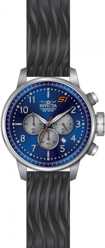 Stainless steel case with a black silicone strap. Fixed stainless steel bezel. Blue dial with luminous gunmetal hands and Arabic numeral hour markers. Minute markers around the outer rim. Dial Type: Analog. Luminescent hands and markers. Date display between the 4 and 5 o'clock positions. Chronograph - three silver sub-dials displaying: 60 second, 60 minute and 24 hour. Hattori caliber VD53 quartz movement. Scratch resistant mineral crystal. Pull / push crown. Solid case back. Case size: 48 mm. Case thickness: 14 mm. Round case shape. Band width: 22 mm. Tang clasp. Water resistant at 100 meters / 330 feet. Functions: chronograph, date, GMT, second time zone, hour, minute, second. Additional Info: in general, suitable for swimming and snorkeling, but not diving. Casual watch style. Watch label: Japan Movt. Invicta S1 Rally Chronograph Mens Watch 23812.