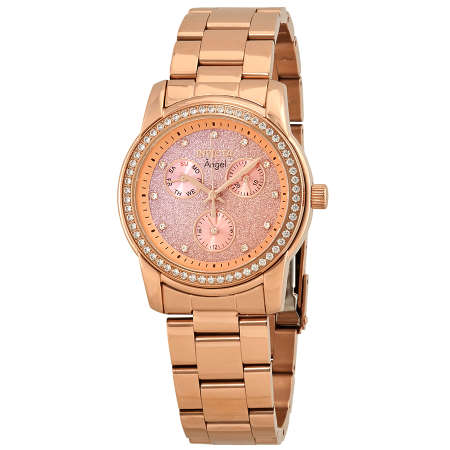 Rose gold-tone stainless steel case with a rose gold-tone stainless steel bracelet. Fixed rose gold-tone stainless steel set with crystals bezel. Gold (glitz) dial with rose gold-tone hands and crystal hour markers. Minute markers around the outer rim. Dial Type: Analog. Date on subdial at 2 o'clock position, day on subdial at 10 o'clock position. Three - date, day of the week and 24-hour subdials. Caliber VH68 quartz movement. Scratch resistant flame fusion crystal. Pull / push crown. Solid case back. Round case shape. Case size: 38 mm. Band width: 20 mm, band length: 8.25 inches. Fold over with safety release clasp. Water resistant at 50 meters / 165 feet. Functions: date, day, hour, minute, second. Dress watch style. Invicta Angel RoseGold Glitz Dial Ladies Multifunction Watch 23823.