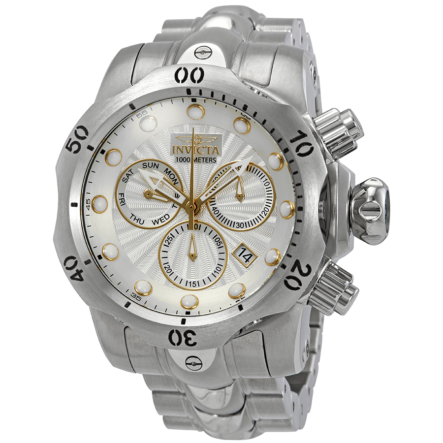 Stainless steel case with a stainless steel bracelet. Uni-directional rotating stainless steel bezel. Antique silver dial with gold-tone skeleton hands and dot hour markers. Minute markers around the outer rim. Dial Type: Analog. Luminescent hands and markers. Date display between the 4 and 5 o'clock positions. Chronograph - two sub-dials displaying: 60 second and 30 minute. Day of the week sub-dial. Caliber: Z60 quartz movement. Scratch resistant flame fusion crystal. Screw down crown. Solid case back. Case size: 53.7 mm. Case thickness: 20 mm. Round case shape. Band width: 26 mm. Band length: 8.25 inches. Deployment clasp with a push button release. Water resistant at 1000 meters / 3300 feet. Functions: chronograph, date, day, hour, minute, second. Casual watch style. Invicta Venom Chronograph Antique Silver Dial Mens Watch 23887.