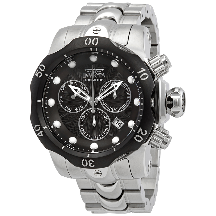 Stainless steel case with a stainless steel bracelet. Uni-directional rotating black ion-plated bezel. Black dial with silver-tone skeleton hands and dot hour markers. Minute markers around the outer rim. Dial Type: Analog. Luminescent hands and markers. Date display between the 4 and 5 o'clock positions. Chronograph - two sub-dials displaying: 60 second and 30 minute. Day of the week sub-dial. Caliber: Z60 quartz movement. Scratch resistant flame fusion crystal. Screw down crown. Solid case back. Case size: 53.7 mm. Case thickness: 20 mm. Round case shape. Band width: 26 mm. Band length: 8.25 inches. Deployment clasp with a push button release. Water resistant at 1000 meters / 3300 feet. Functions: chronograph, date, day, hour, minute, second. Casual watch style. Invicta Venom Chronograph Black Dial Mens Watch 23888.