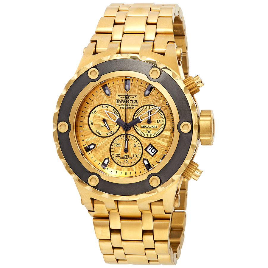 Gold-tone stainless steel case and bracelet. Fixed gold-tone bezel with a silver-tone top ring. Gold dial with gold-tone hands and index hour markers. Minute markers around the outer rim. Dial Type: Analog. Luminescent hands and markers. Date display between 4 and 5 o'clock position. Chronograph - two sub-dials displaying: 60 second and 30 minute. Day of the week sub-dial at the 9 o'clock position. Ronda Caliber Z60 quartz movement. Scratch resistant flame fusion crystal. Screw down crown. Solid case back. Case size: 52 mm. Round case shape. Band width: 31 mm. Band length: 8.25 inches. Deployment diver safety clasp. Water resistant at 500 meters / 1650 feet. Functions: chronograph, date, day, hour, minute, small second. Dive watch style. Watch label: Swiss Movt. Invicta Subaqua Chronograph Gold Dial Mens Watch 23922.