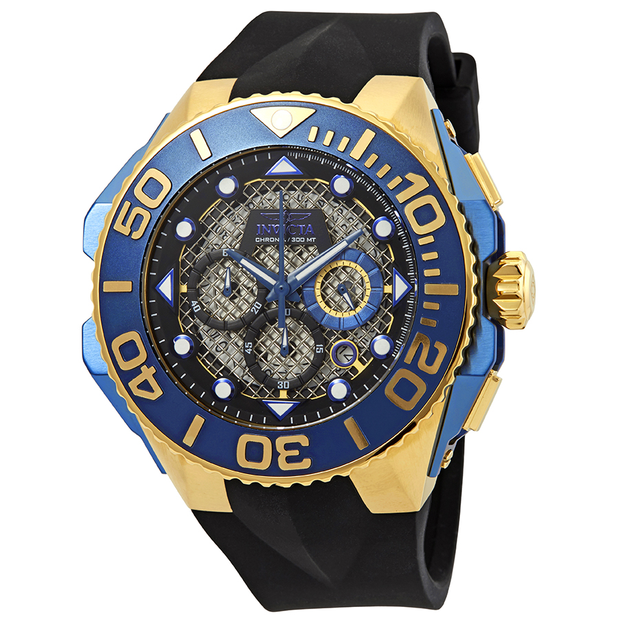Yellow gold-plated stainless steel case with a black silicone strap. Uni-directional rotating yellow gold-plated bezel with a blue aluminium top ring. Black dial with luminous blue hands and dot hour markers. Minute markers around the outer rim. Dial Type: Analog. Luminescent hands and markers. Date display between the 4 and 5 o'clock positions. Caliber: VD53 quartz movement. Scratch resistant mineral crystal. Screw down crown. Solid case back. Case size: 53.5 mm. Round case shape. Band width: 29.8 mm. Band length: 8.25 inches. Tang clasp. Water resistant at 300 meters / 1000 feet. Functions: chronograph, date, hour, minute, second. Casual watch style. Invicta Coalition Forces Chronograph Vlack Dial Mens Watch 23960.