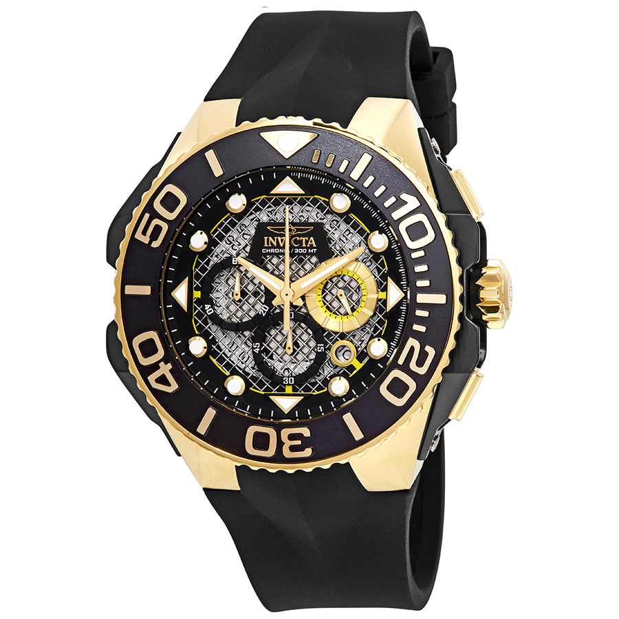 Yellow gold-plated stainless steel case with a black silicone strap. Uni-directional rotating yellow gold-plated bezel with a black aluminium top ring. Black dial with luminous yellow gold-tone hands and dot hour markers. Minute markers around the outer rim. Dial Type: Analog. Luminescent hands and markers. Date display between the 4 and 5 o'clock positions. Caliber: VD53 quartz movement. Scratch resistant mineral crystal. Screw down crown. Solid case back. Case size: 53.5 mm. Round case shape. Band width: 29.8 mm. Band length: 8.25 inches. Tang clasp. Water resistant at 300 meters / 1000 feet. Functions: chronograph, date, hour, minute, second. Casual watch style. Invicta Coalition Forces Chronograph Black Dial Mens Watch 23961.