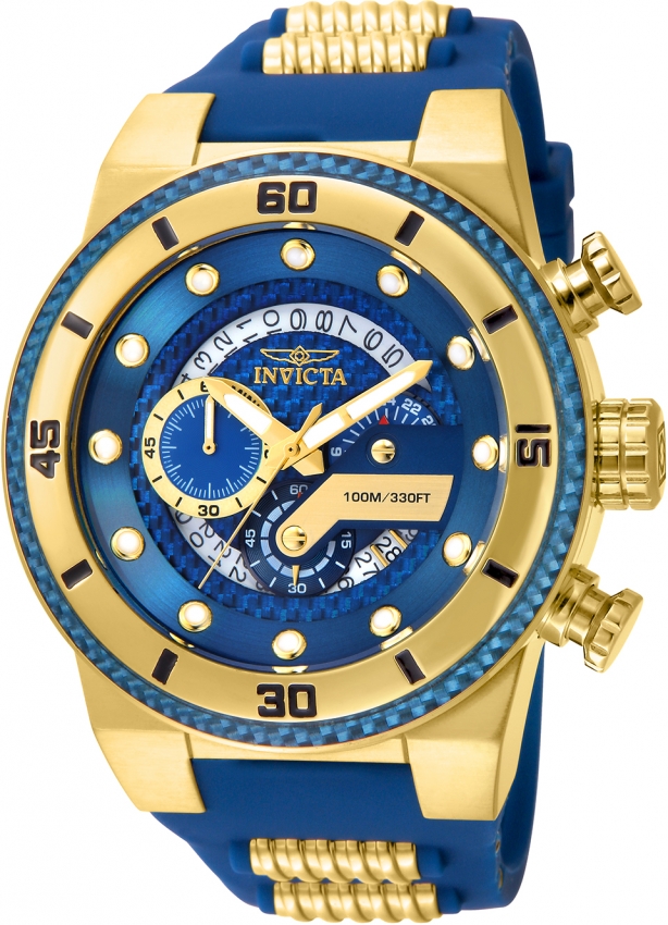 Yellow gold-plated stainless steel case with a blue silicone strap with yellow gold-plated accents. Fixed yellow gold-plated bezel with a blue glass fiber rim. Blue dial with luminous yellow gold-tone hands and dot hour markers. Dial Type: Analog. Luminescent hands and markers. Date display between the 4 and 5 o'clock positions. Chronograph - three sub-dials displaying: 60 second, 60 minute and 24 hour. Hattori Caliber VD53 quartz movement. Scratch resistant flame fusion crystal. Pull / push crown. Solid case back. Case size: 51 mm. Case thickness: 15 mm. Round case shape. Band width: 30 mm. Band length: 8.25 inches. Tang clasp. Water resistant at 100 meters / 330 feet. Functions: chronograph, date, GMT, second time zone, hour, minute, second. Casual watch style. Watch label: Swiss Movt. Invicta S1 Rally Chronograph Blue Dial Mens Watch 24224.