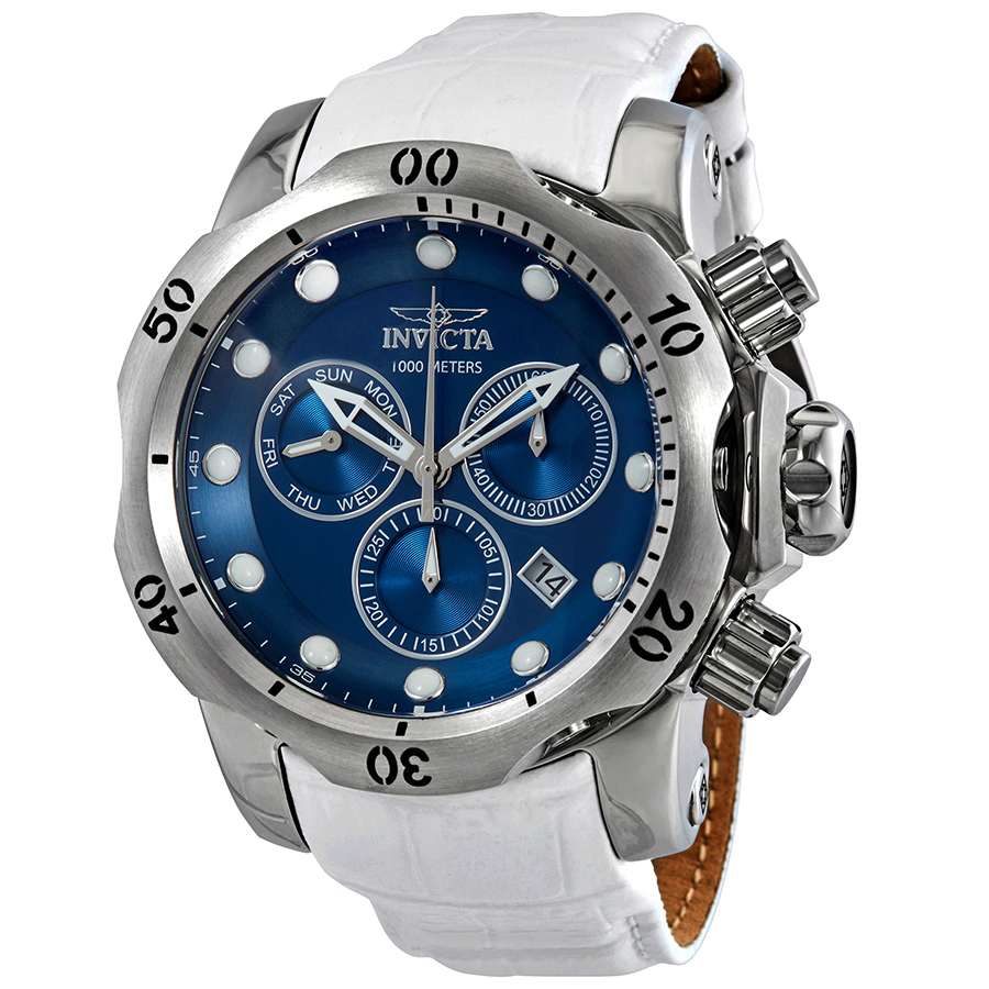 Silver-tone stainless steel case with a white leather strap. Uni-directional rotating silver-tone stainless steel bezel. Blue dial with silver-tone skeleton hands and dot hour markers. Minute markers around the outer rim. Dial Type: Analog. Luminescent hands and markers. Date display between the 4 and 5 o'clock positions, day on subdial between 9 and 10 o'clock. Chronograph - three sub-dials displaying: 60 second, 30 minute, day of the week. Ronda Caliber Z60 quartz movement. Scratch resistant mineral crystal. Screw down crown. Solid case back. Round case shape. Case size: 53.7 mm. Band width: 26 mm, band length: 8.25 inches. Tang clasp. Water resistant at 1000 meters / 3300 feet. Functions: chronograph, date, day, hour, minute, small second. Additional Info: in general, suitable for professional marine activity and serious surface water sports, but not diving. Dive watch style. Invicta Venom Chronograph Blue Dial Mens Watch 24350.
