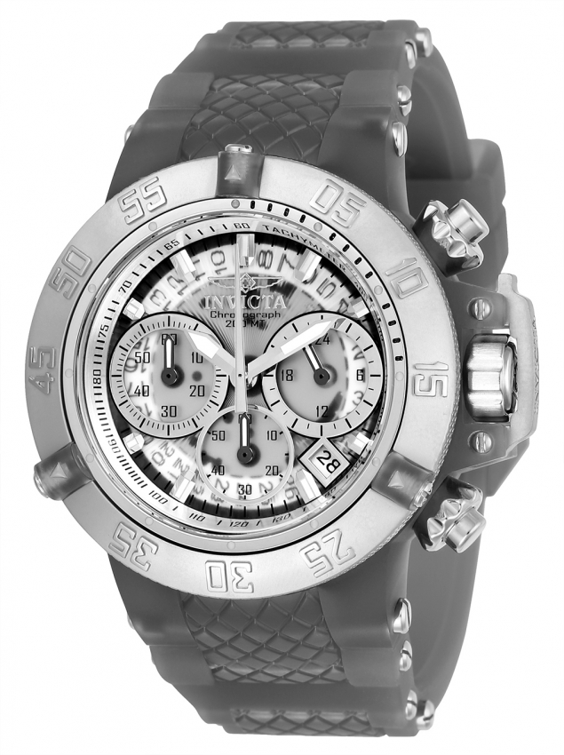 Stainless steel case with a grey silicone strap with silver-tone pins. Uni-directional rotating stainless steel bezel. White dial with luminous silver-tone hands and index hour markers. Minute markers. Tachymeter markings around the outer rim. Dial Type: Analog. Luminescent hands and markers. Date display between the 4 and 5 o'clock positions. Chronograph - three sub-dials displaying: 60 second, 60 minute and 24 hour. Hattori caliber VD53 quartz movement. Scratch resistant mineral crystal. Screw down crown. Case size: 42 mm. Case thickness: 16.5 mm. Round case shape. Band width: 24.5 mm. Water resistant at 200 meters / 660 feet. Functions: chronograph, date, GMT, second time zone, hour, minute, second. Sport watch style. Invicta Subaqua White Dial Chronograph Ladies Watch 24378.