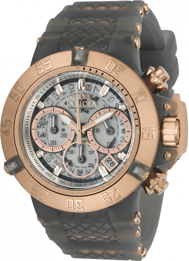 Stainless steel case with a grey silicone and plastic strap. Stainless steel rose gold-tone bezel. White dial with gold-tone hands and index hour markers. Minute markers around the outer rim. Dial Type: Analog. Luminescent hands and markers. Date display between 4 and 5 o'clock position. Chronograph - sub-dials displaying: three - 60 second, 60 minute and 24 hour. Hattori Caliber VD53 quartz movement. Scratch resistant mineral crystal. Screw down crown. Case size: 42 mm. Round case shape. Band width: 24.5 mm. Water resistant at 200 meters / 660 feet. Functions: chronograph, date, GMT, second time zone, hour, minute, second. Sport watch style. Invicta Subaqua White Dial Chronograph Ladies Watch 24380.