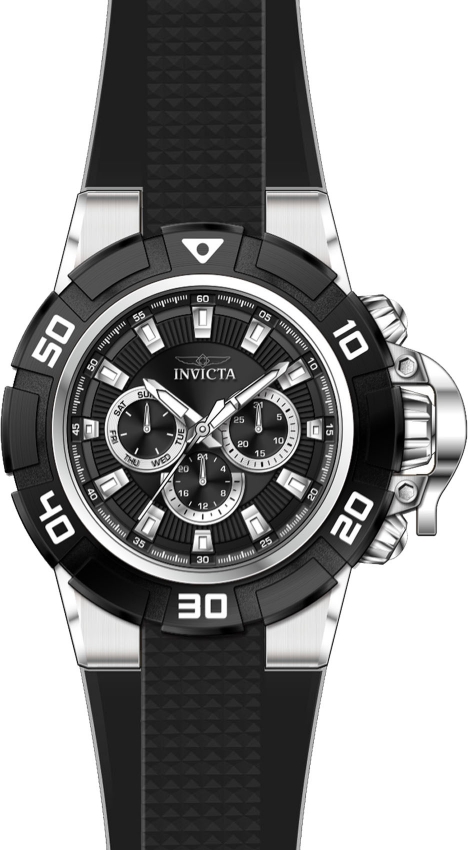 Stainless steel case with a blue silicone strap. Uni-directional rotating black ion-plated bezel. Black dial with silver-tone hands and index hour markers. Minute markers around the outer rim. Dial Type: Analog. Luminescent hands and markers. Three multi-function sub-dials displaying: 24 hour, date and day of the week. Caliber: 9238/1970 quartz movement. Scratch resistant flame fusion crystal. Pull / push crown. Solid case back. Case size: 52 mm. Round case shape. Band width: 32 mm. Band length: 8.25 inches. Tang clasp. Water resistant at 100 meters / 330 feet. Functions: date, day, hour, minute, second, 24 hour. Casual watch style. Invicta I-Force Blue Dial Mens Watch 24386.