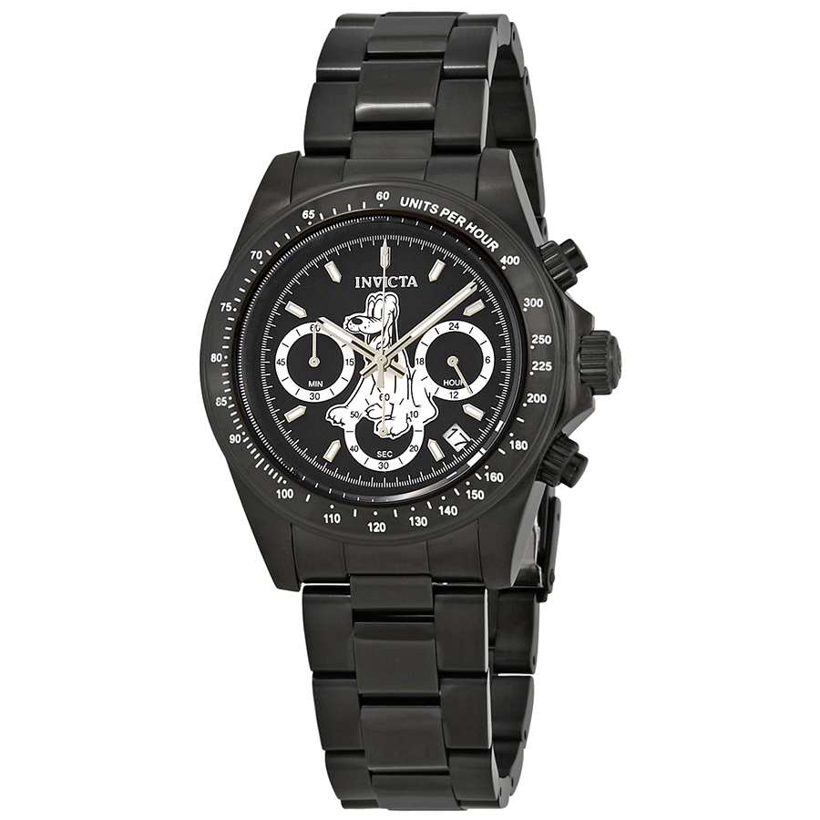Black ion-plated stainless steel case and bracelet. Fixed black ion-plated bezel showing tachymeter markings. Black dial with luminous silver-tone hands and index hour markers. Minute markers around the outer rim. Dial Type: Analog. Luminescent hands and markers. Date display between the 4 and 5 o'clock positions. Chronograph - three sub-dials displaying: 60 second, 60 minute and 24 hour. Hattori caliber VD53 quartz movement. Scratch resistant mineral crystal. Screw down crown. Solid case back. Case size: 39.5 mm. Case thickness: 13 mm. Round case shape. Band width: 20 mm. Band length: 8 inches. Fold over clasp with a safety release. Water resistant at 200 meters / 660 feet. Functions: chronograph, tachymeter, date, GMT, second time zone, hour, minute, second. Casual watch style. Invicta Disney Limited Edition Pluto Chronograph Mens Watch 24399.