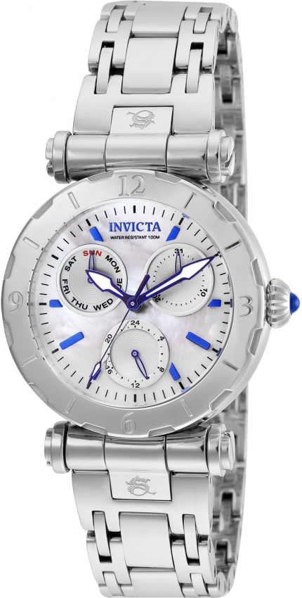 Stainless steel case with a stainless steel bracelet. Fixed stainless steel bezel. Mother of pearl dial with luminous blue hands and index hour markers. Minute markers around the outer rim. Dial Type: Analog. Luminescent hands and markers. Three multi-function sub-dials displaying: 24 hours, date and day of the week subdials. Caliber VH68 quartz movement. Scratch resistant flame fusion crystal. Pull / push crown. Solid case back. Case size: 38 mm. Case thickness: 11.25 mm. Round case shape. Band width: 24 mm. Band length: 7.75 inches. Fold over clasp with a safety releasep. Water resistant at 100 meters / 330 feet. Functions: date, day, hour, minute, second, 24 hour. Additional Info: in general, suitable for swimming and snorkeling, but not diving. Casual watch style. Invicta Subaqua Mother of Pearl Dial Ladies Watch 24427.