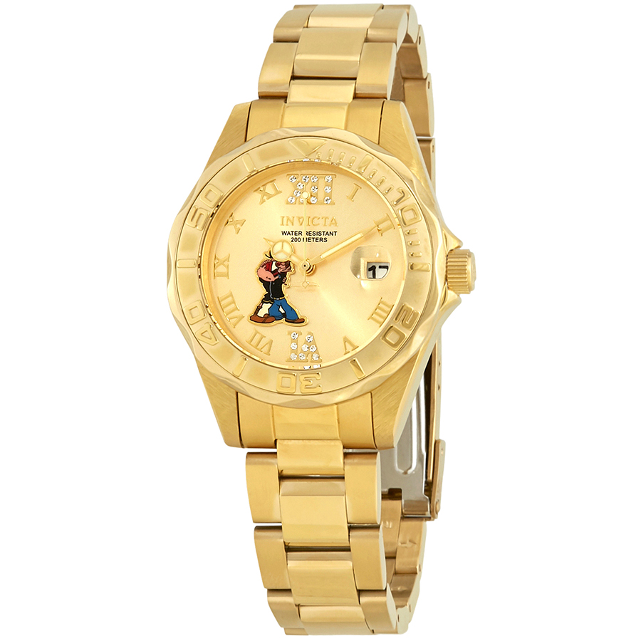 Yellow gold-plated stainless steel case and bracelet. Uni-directional rotating yellow gold-plated bezel. Gold dilal with Popeye and Olive Oyl mottif with luminous yellow gold-tone hands and Roman numeral hour markers. Crystal-set Roman numerals at the 6 and 12 o'clock positions. Dial Type: Analog. Luminescent hands. Date display at the 3 o'clock position. Hattori caliber PC32A quartz movement. Scratch resistant mineral crystal. Pull / push crown. Solid case back. Round case shape. Case size: 38 mm. Case thickness: 11 mm. Band width: 18 mm. Fold over clasp. Water resistant at 200 meters / 660 feet. Functions: date, hour, minute, second. Additional Info: : in general, suitable for swimming and snorkeling, but not diving. Dress watch style. Invicta Character Gold Dial Yellow Gold-plated Ladies Watch 24473.