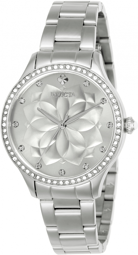Stainless steel case with a stainless steel bracelet. Fixed stainless steel set with crystals bezel. Silver dial with silver-tone hands and crystal hour markers. Dial Type: Analog. Luminescent hands. Caliber PC11 quartz movement. Scratch resistant Flame Fusion crystal. Pull / push crown. Solid case back. Case size: 35 mm. Case thickness: 10 mm. Round case shape. Band width: 16 mm. Band length: 6.85 inches. Fold over clasp with a push button release. Water resistant at 100 meters / 330 feet. Functions: hour, minute, second. Casual watch style. Invicta Wildflower Silver Dial Ladies Watch 24536.