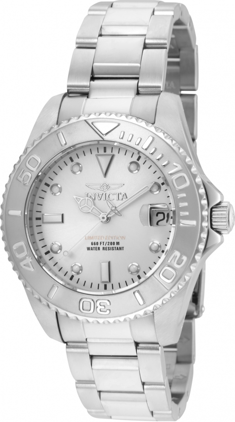 Stainless steel case with a stainless steel bracelet. Uni-directional rotating stainless steel bezel. Silver dial with luminous silver-tone hands and dot hour markers. Minute markers around the outer rim. Dial Type: Analog. Luminescent hands and markers. Date display at the 3 o'clock position. ISA Caliber 2331F quartz movement. Scratch resistant mineral crystal. Pull / push crown. Solid case back. Round case shape. Case size: 38 mm. Case thickness: 12.3 mm. Band width: 18 mm. Fold over clasp. Water resistant at 100 meters / 330 feet. Functions: date, hour, minute, second. Casual watch style. Invicta Pro Diver Silver Dial Ladies Watch 24630.