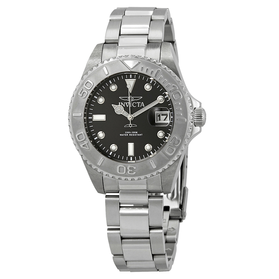 Stainless steel case with a stainless steel bracelet. Uni-directional rotating coin edge stainless steel bezel. Black dial with luminous silver-tone Breguet-style hands and dot hour markers. Minute markers around the outer rim. Dial Type: Analog. Luminescent hands and markers. Date display at the 3 o'clock position. ISA caliber 2331F quartz movement. Scratch resistant mineral crystal. Pull / push crown. Solid case back. Round case shape. Case size: 38 mm. Case thickness: 12.3 mm. Band width: 18 mm. Fold over clasp. Water resistant at 200 meters / 660 feet. Functions: date, hour, minute, second. Pro Diver Series. Casual watch style. Invicta Pro Diver Black Ladies Watch 24631.