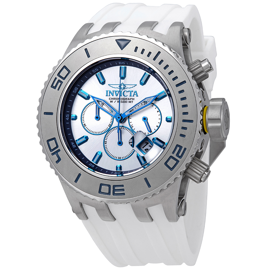 Stainless steel case with a white silicone strap. Uni-directional rotating stainless steel bezel. Silver dial with blue skeleton hands and index hour markers. Minute markers around the outer rim. Dial Type: Analog. Luminescent hands and markers. Date display between the 4 and 5 o'clock positions. Chronograph - three sub-dials displaying: 60 second, 60 minute and 24 hour. Hattori caliber VD53 quartz movement. Scratch resistant mineral crystal. Screw down crown. Solid case back. Round case shape. Case size: 52 mm. Case thickness: 16 mm. Band width: 31 mm. Tang clasp. Water resistant at 500 meters / 1650 feet. Functions: chronograph, date, GMT, second time zone, hour, minute, second. Dive watch style. Invicta Subaqua Chronograph Silver Dial Mens Watch 24657.