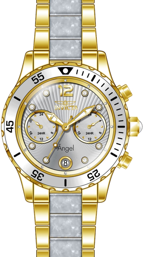 Yellow gold-plated stainless steel case with a two-tone (yellow gold-plated and white) stainless steel with silver marbleized resin strap. Uni-directional rotating coin edge stainless steel bezel with a silver aluminium count-up elapsed time top ring. Silver mother of pearl dial with luminous yellow gold-tone sword-shaped hands and dot hour markers. Arabic numeral appears at the 12 o'clock position. Dial Type: Analog. Luminescent hands and markers. Date display at the 6 o'clock position. Dual 24 hour subdials. Hattori Caliber VD57 quartz movement. Scratch resistant flame fusion crystal. Pull / push crown. Solid case back. Round case shape, case size: 40 mm, case thickness: 15 mm. Band width: 20 mm, band length: 7.25 inches. Fold over with safety release clasp. Water resistant at 100 meters / 330 feet. Functions: date, hour, minute, second. Additional Info: suitable for snorkeling as well as swimming but not diving. Angel Series. Casual watch style. Watch label: Japan Movt. Invicta Angel Silver Mother of Pearl Dial Quartz Ladies Watch 24702.
