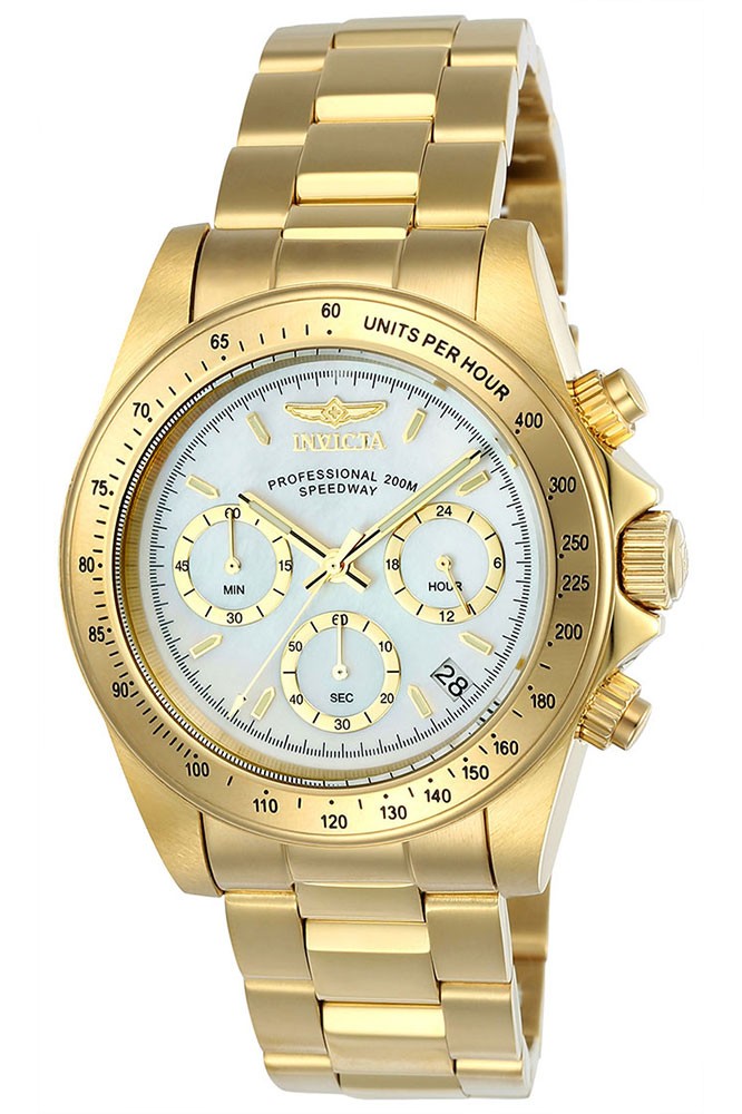Yellow gold-tone stainless steel case and bracelet. Fixed yellow gold-tone bezel showing tachymeter markings. White dial with luminous yellow gold-tone hands and index hour markers. Minute markers around the outer rim. Dial Type: Analog. Luminescent hands and markers. Date display between the 4 and 5 o'clock positions. Chronograph - three sub-dials displaying: 60 second, 60 minute and 24 hour. Hattori caliber VD53 quartz movement. Scratch resistant mineral crystal. Screw down crown. Solid case back. Round case shape. Case size: 39.5 mm. Case thickness: 14 mm. Band width: 20 mm. Diver clasp. Water resistant at 200 meters / 660 feet. Functions: chronograph, tachymeter, date, GMT, second time zone, hour, minute, second. Pro Diver Series. Casual watch style. Watch label: Japan Movt. Invicta Pro Diver Chronograph Quartz White Dial Mens Watch 24770.