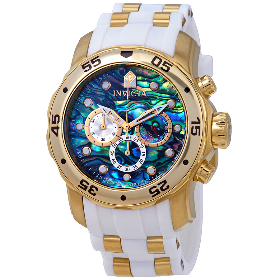 Gold-tone stainless steel case with a white polyurethane strap with gold-toner accents. Fixed gold-tone bezel. Abalone dial with gold-tone skeleton hands and index hour markers. Minute markers around the outer rim. Dial Type: Analog. Luminescent hands and markers. Chronograph - three sub-dials displaying: 60 second, 60 minute and 24 hour. Hattori caliber VD54 quartz movement. Scratch resistant flame fusion crystal. Pull / push crown. Solid case back. Round case shape. Case size: 48 mm. Case thickness: 17 mm. Band width: 26 mm. Tang clasp. Water resistant at 50 meters / 165 feet. Functions: chronograph, GMT, second time zone, hour, minute, second. Additional Info: in general, suitable for short periods of recreational swimming, but not diving or snorkeling. Sport watch style. Invicta Pro Diver Chronograph Mens Watch 24840.