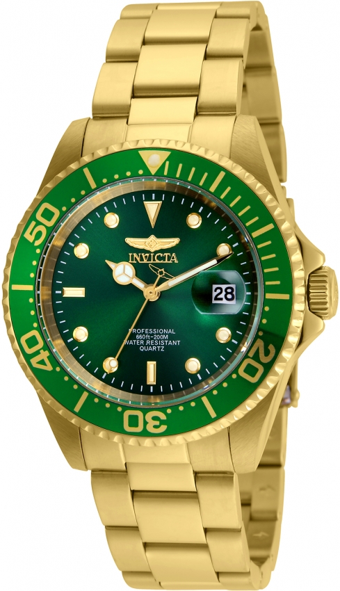 Yellow gold-tone stainless steel case and bracelet. Uni-directional rotating yellow gold-tone bezel with an inlaid green ring. Green dial with luminous yellow gold-tone hands and dot hour markers. Minute markers around the outer rim. Dial Type: Analog. Luminescent hands and markers. Date display at the 3 o'clock position. Hattori Caliber PC32A quartz movement. Scratch resistant mineral crystal. Pull / push crown. Round case shape. Case size: 40 mm. Band width: 20 mm. Fold over clasp with a safety release. Water resistant at 200 meters / 660 feet. Functions: date, hour, minute, second. Pro Diver Series. Sport watch style. Invicta Pro Diver Green Dial Mens Watch 24948.