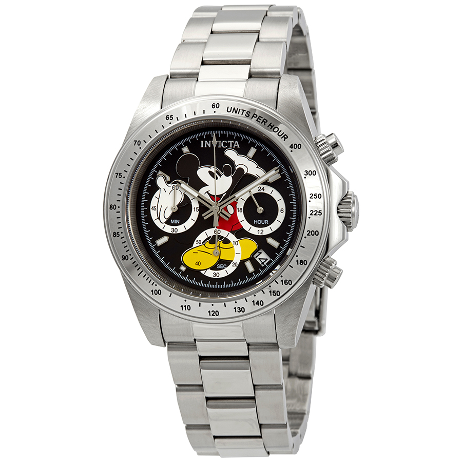 Silver-tone stainless steel case with a stainless steel bracelet. Fixed tachymeter scale silver-tone stainless steel showing tachymeter markings bezel. Black (mickey mouse) dial with luminous silver-tone hands and index hour markers. Minute markers around the outer rim. Dial Type: Analog. Luminescent hands. Date display betweenthe 4 and 5 o'clock positions. Chronograph - three sub-dials displaying: 60 second, 60 minute and 24 hour. Hattori Caliber VD53 quartz movement. Scratch resistant mineral crystal. Screw down crown. Solid case back. Round case shape, case size: 39.5 mm, case thickness: 13.5 mm. Band width: 20 mm, band length: 8 inches. Fold over with safety release clasp. Water resistant at 200 meters / 660 feet. Functions: chronograph, tachymeter, date, GMT, second time zone, hour, minute, second. Additional Info: in general, suitable for professional marine activity and serious surface water sports, but not diving. Casual watch style. Watch label: Japan Movt. Invicta Disney Limited Edition Mickey Mouse Chronograph Black Dial Mens Watch 25192.