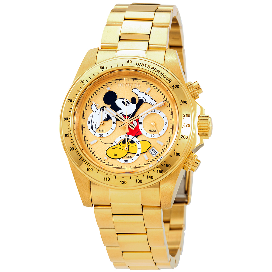 Yellow gold-plated stainless steel case with a yellow gold-plated stainless steel bracelet. Fixed tachymeter scale yellow gold-plated stainless steel bezel. Gold (mickey mouse) dial with luminous yellow gold-tone hands and index hour markers. Minute markers around the outer rim. Dial Type: Analog. Luminescent hands and markers. Date display between 4 and 5 o'clock position. Chronograph - three sub-dials displaying: 60 second, 60 minute and 24 hour. Hattori Caliber VD53 quartz movement. Scratch resistant mineral crystal. Screw down crown. Solid case back. Round case shape, case size: 39.5 mm, case thickness: 13.5 mm. Band width: 20 mm. Fold over with safety release clasp. Water resistant at 200 meters / 660 feet. Functions: chronograph, date, GMT, second time zone, hour, minute, second. Sport watch style. Watch label: Japan Movt. Invicta Disney Limited Edition Mickey Mouse Chronograph Gold Dial Mens Watch 25196.
