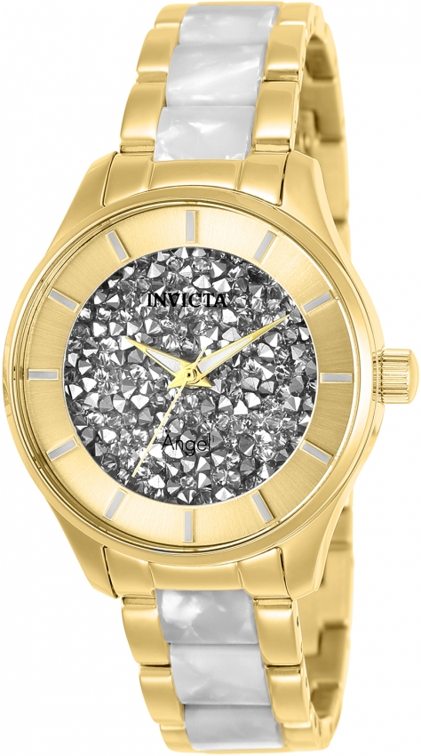 Yellow gold-plated stainless steel case with a yellow gold-plated stainless steel bracelet with white marbled acetate center links. Fixed yellow gold-plated bezel. Yellow gold (grey crystal-set) dial with luminous yellow gold-tone hands and index hour markers. Dial Type: Analog. Luminescent hands and markers. Hattori caliber PC21 quartz movement. Scratch resistant flame fusion crystal. Pull / push crown. Solid case back. Round case shape. Case size: 34 mm. Case thickness: 15 mm. Band width: 16 mm. Fold over clasp with a push button release. Water resistant at 100 meters / 330 feet. Functions: hour, minute, second. Additional Info: in general, suitable for swimming and snorkeling, but not diving. Casual watch style. Invicta Angel Yellow Gold Dial Ladies Watch 25245.