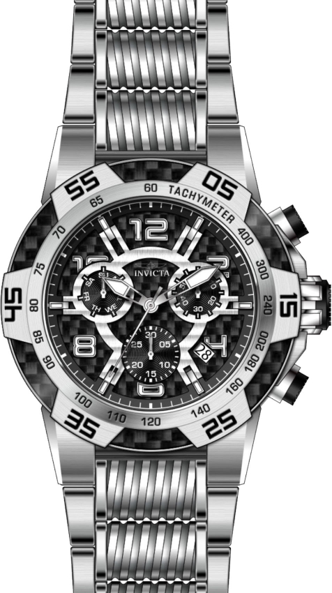 Stainless steel case with a stainless steel bracelet. Fixed silver-tone and black carbon fiber bezel showing tachymeter markings. Black carbon fiber dial with luminous silver-tone hands and Arabic numeral and index hour markers. Minute markers around the outer rim. Dial Type: Analog. Luminescent hands and markers. Date display between the 4 and 5 o'clock positions. Chronograph - two sub-dials displaying: 60 second and 30 minute. Day of the week sub-dial. Ronda caliber Z60 quartz movement. Scratch resistant flame fusion crystal. Pull / push crown. Solid case back. Round case shape. Case size: 51 mm. Case thickness: 15.5 mm. Band width: 30 mm. Band length: 9 inches. Fold over clasp with a safety release. Water resistant at 100 meters / 330 feet. Functions: chronograph, date, day, hour, minute, small second. Additional Info: in general, suitable for swimming and snorkeling, but not diving. Sport watch style. Invicta Speedway Chronograph Black Carbon Fiber Dial Mens Watch 25285.