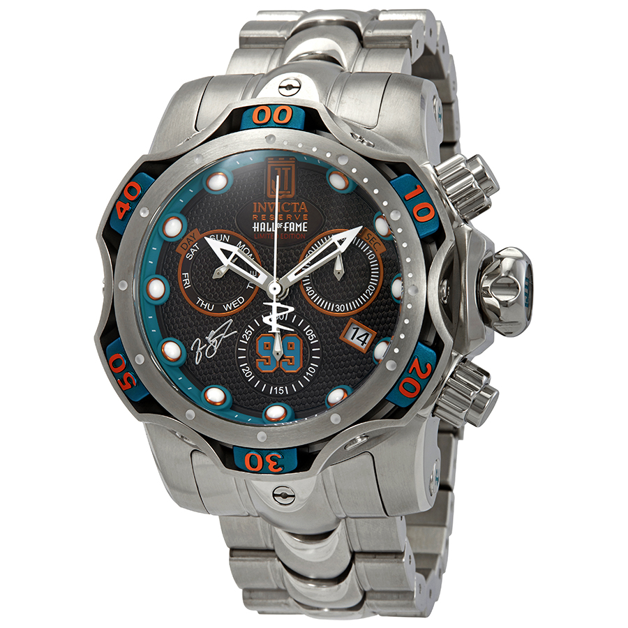 Silver-tone stainless steel case with a silver-tone stainless steel bracelet. Uni-directional rotating silver-tone and blue aluminum bezel. Black dial with silver-tone hands and index hour markers. Minute markers around the outer rim. Dial Type: Analog. Luminescent hands and markers. Date display between 4 and 5 o'clock position. Chronograph - three sub-dials displaying: 60 second and 30 minute. day of the week sub-dial at the 9 o'clock position. Ronda Caliber Z60 quartz movement. Scratch resistant flame fusion crystal. Screw down crown. Solid case back. Round case shape. Case size: 52.5 mm. Band width: 26 mm. Deployment with push button release clasp. Water resistant at 1000 meters / 3300 feet. Functions: chronograph, date, day, hour, minute, small second. Dive watch style. Invicta Jason Taylor Chronograph Black Dial Mens Watch 25303.