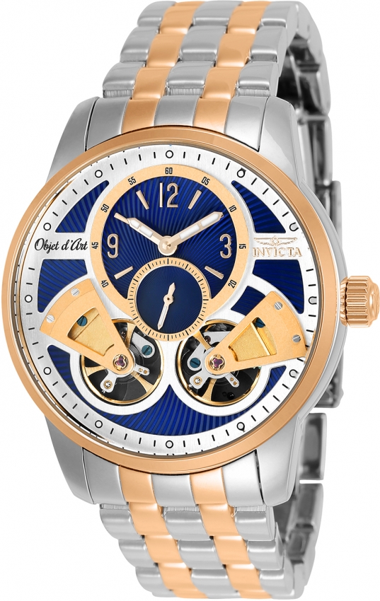 Stainless steel case with a two-tone (silver-tone and rose gold-plated) stainless steel bracelet. Fixed rose gold-plated bezel. Blue and white (open heart) dial with rose gold-tone hands and index hour markers. Arabic numerals mark the 3, 9 and 12 o'clock positions. Minute markers around the outer rim. Dial Type: Analog. Luminescent hands and markers. Caliber S-05A automatic movement. Scratch resistant flame fusion crystal. Pull / push crown. Transparent case back. Round case shape. Case size: 44 mm. Case thickness: 15 mm. Band width: 22 mm. Band length: 8 inches. Fold over clasp with a safety release. Water resistant at 50 meters / 165 feet. Functions: hour, minute, small second. Casual watch style. Invicta Objet D Art Automatic Blue Dial Mens Watch 25578.