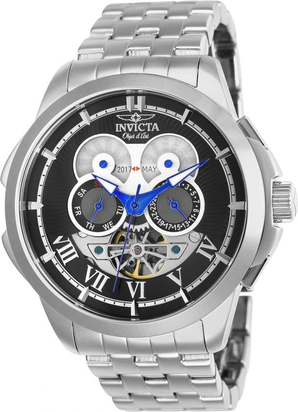 Silver-tone stainless steel case with a silver-tone stainless steel bracelet. Fixed silver-tone stainless steel bezel. Black dial with silver-tone hands and Roman numeral and index hour markers. Minute markers around the outer rim. Dial Type: Analog. Luminescent hands and markers. Date display at the 3 o'clock position. Sea-Gull Caliber TY2503 automatic movement. Scratch resistant flame fusion crystal. Pull / push crown. Round case shape. Case size: 48 mm. Band width: 24 mm. Butterfly clasp. Water resistant at 50 meters / 165 feet. Functions: year, month, date, day, hour, minute, second. Sport watch style. Invicta Objet D Art Automatic Complete Calendar Calendar Mens Watch 25580.