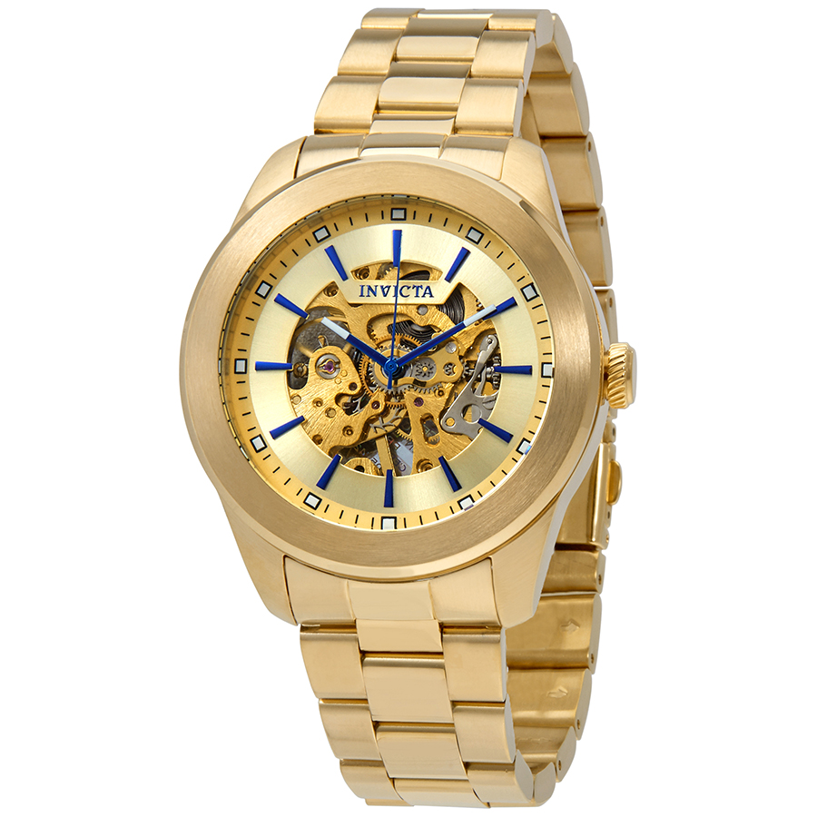 Yellow gold-plated stainless steel case and bracelet. Fixed yellow gold-plated bezel. Gold (skeleton center) dial with luminous blue hands and index hour markers. Minute markers around the outer rim. Dial Type: Analog. Luminescent hands and markers. STBL-005BS mechanical movement. Scratch resistant flame fusion crystal. Pull / push crown. Transparent case back. Round case shape. Case size: 45 mm. Case thickness: 14.5 mm. Band width: 22 mm. Band length: 7.65 inches. Fold over with safety release clasp. Water resistant at 100 meters / 330 feet. Functions: hour, minute, second. Casual watch style. Invicta Vintage Mechanical Mens Watch 25759.