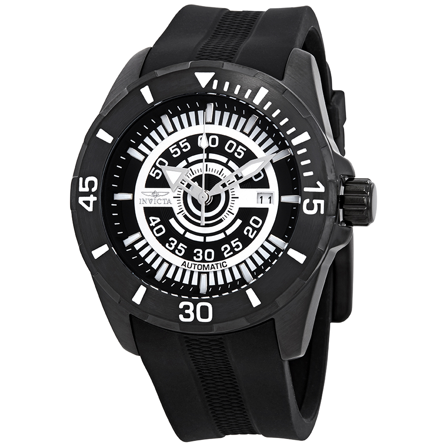 Black ion-plated stainless steel case with a black silicone strap. Fixed black ion-plated bezel. Black dial with luminous silver-tone hands and index hour markers. Arabic numeral minute markers (at 5 minute intervals). Minute markers around the outer rim. Dial Type: Analog. Luminescent hands and markers. Date display at the 3 o'clock position. SII caliber NH35A automatic movement with a 41-hour power reserve. Scratch resistant flame fusion crystal. Pull / push crown. Transparent case back. Round case shape. Case size: 48 mm. Case thickness: 15 mm. Band width: 26 mm. Band length: 9.25 inches. Tang clasp. Water resistant at 100 meters / 330 feet. Functions: date, hour, minute, second. Additional Info: in general, suitable for swimming and snorkeling, but not diving. Casual watch style. Invicta S1 Rally Automatic Black Dial Mens Watch 25774.