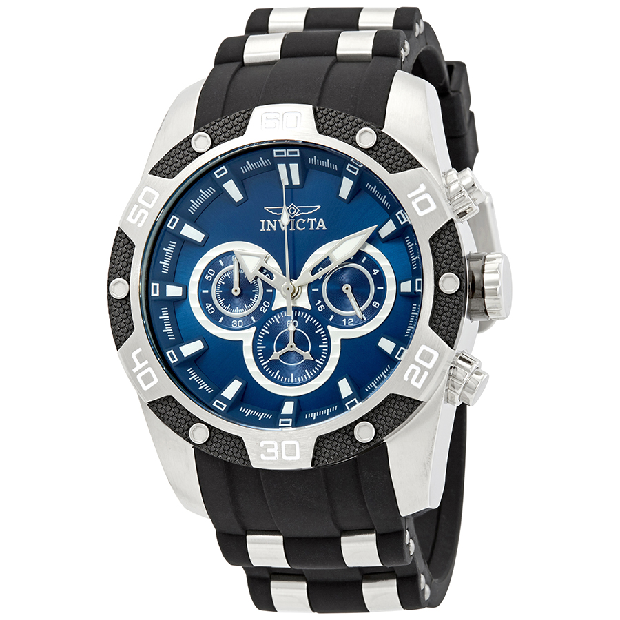 Silver-tone stainless steel case with a black polyurethane silicone with stainless steel strap. Uni-directional rotating silver-tone stainless steel with black inlays bezel. Blue dial with luminous silver-tone arrow-shaped hands and index hour markers. Minute markers around the outer rim. Dial Type: Analog. Luminescent hands and markers. Chronograph - three sub-dials displaying: 60 second, 60 minute and 24 hour. Hattori Caliber VD54 quartz movement. Scratch resistant flame fusion crystal. Pull / push crown. Solid case back. Round case shape, case size: 48 mm, case thickness: 16 mm. Band width: 26 mm. Tang clasp. Water resistant at 100 meters / 330 feet. Functions: chronograph, GMT, second time zone, hour, minute, second. Sport watch style. Watch label: Japan Movt. Invicta Speedway Chronograph Blue Dial Mens Watch 25833.