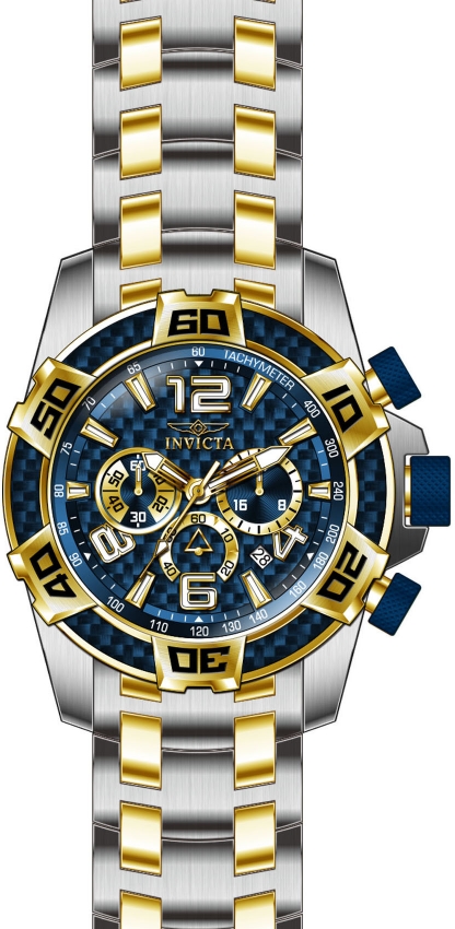 Stainless steel case with a two-tone (silver-tone and yellow gold-plated) stainless steel bracelet. Fixed yellow gold-plated bezel with blue glass fiber inlay. Blue glass fiber dial with luminous yellow gold-tone hands and Arabic numeral hour markers. Tachymeter scale around the outer rim. Dial Type: Analog. Luminescent hands and markers. Date display between the 4 and 5 o'clock positions. Chronograph - three sub-dials displaying: 60 second, 60 minute and 24 hour. Hattori caliber VD53 quartz movement. Scratch resistant flame fusion crystal. Pull / push crown. Solid case back. Round case shape. Case size: 50 mm. Case thickness: 18 mm. Band width: 26 mm. Band length: 7.6 inches. Fold over clasp with a safety release. Water resistant at 100 meters / 330 feet. Functions: chronograph, date, GMT, second time zone, hour, minute, second. Sport watch style. Invicta Pro Diver Chronograph Blue Glass Fiber Dial Mens Watch 25855.