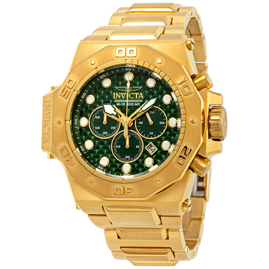 Yellow gold-tone stainless steel case with a yellow gold-tone stainless steel bracelet. Uni-directional rotating yellow gold-tone stainless steel bezel. Green dial with luminous yellow gold-tone hands and dot hour markers. Minute markers around the outer rim. Dial Type: Analog. Luminescent hands and markers. Date display between the 4 and 5 o'clock positions. Chronograph - three sub-dials displaying: 60 second, 60 minute and 24 hour. Hattori Caliber VD53 quartz movement. Scratch resistant mineral crystal. Screw down crown. Solid case back. Round case shape. Case size: 58 mm. Band width: 32 mm, band length: 8.25 inches. Deployment with push button release clasp. Water resistant at 300 meters / 1000 feet. Functions: chronograph, date, hour, minute, second. Dive watch style. Invicta Akula Chronograph Green Dial Mens Watch 26042.